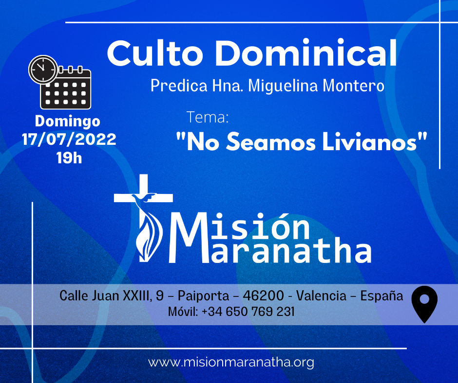 Domingo, 17 de Julio a las 19h en directo desde www.misionmaranatha.org/canaldirecto/ 14 julio, 2022 Desactivado Por Misión Maranatha Vigilia de Oración Sábado 16/07/2022 a las 20h Culto Dominical 17-07-2022 – Misión Maranatha – Paiporta – Valencia – España