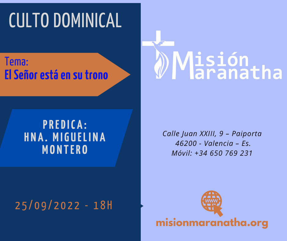 Domingo, 25 de Septiembre a las 18h en directo desde www.misionmaranatha.org/canaldirecto/ 25 septiembre, 2022 Desactivado Por Misión Maranatha Culto Dominical 18-09-2022 – Misión Maranatha – Paiporta – Valencia – España Culto Dominical 25-09-2022 – Misión Maranatha – Paiporta – Valencia – España