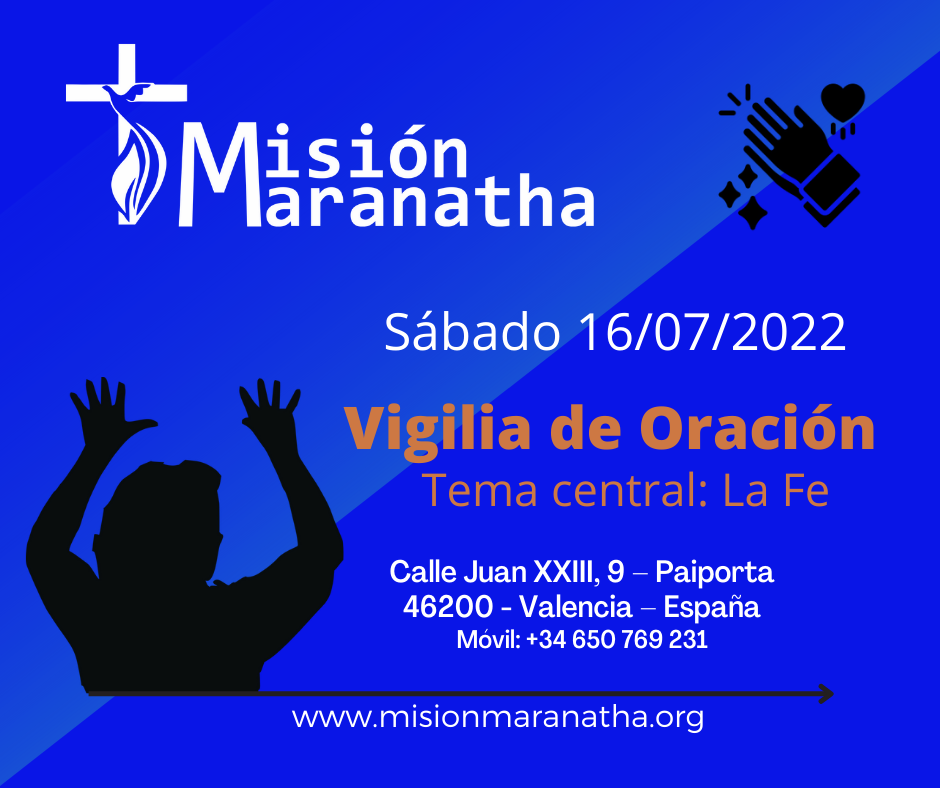 Recuerda te esperamos este próximo sábado a partir de las 20hs para la vigilia que tendrá lugar en la iglesia Misión Maranatha ubicada en Calle Joan xxlll n°9 – bajo – Paiporta – Valencia – España.